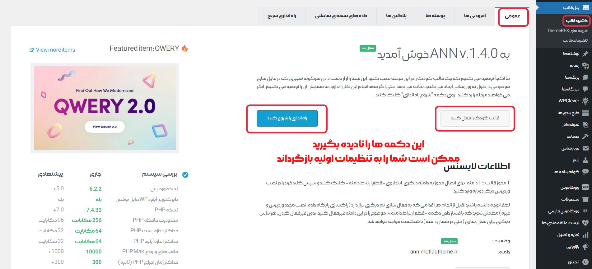 پس از نصب قالب به توضیحات تصویر زیر دقات نموده و دکمه های انتخاب شده را نزنید