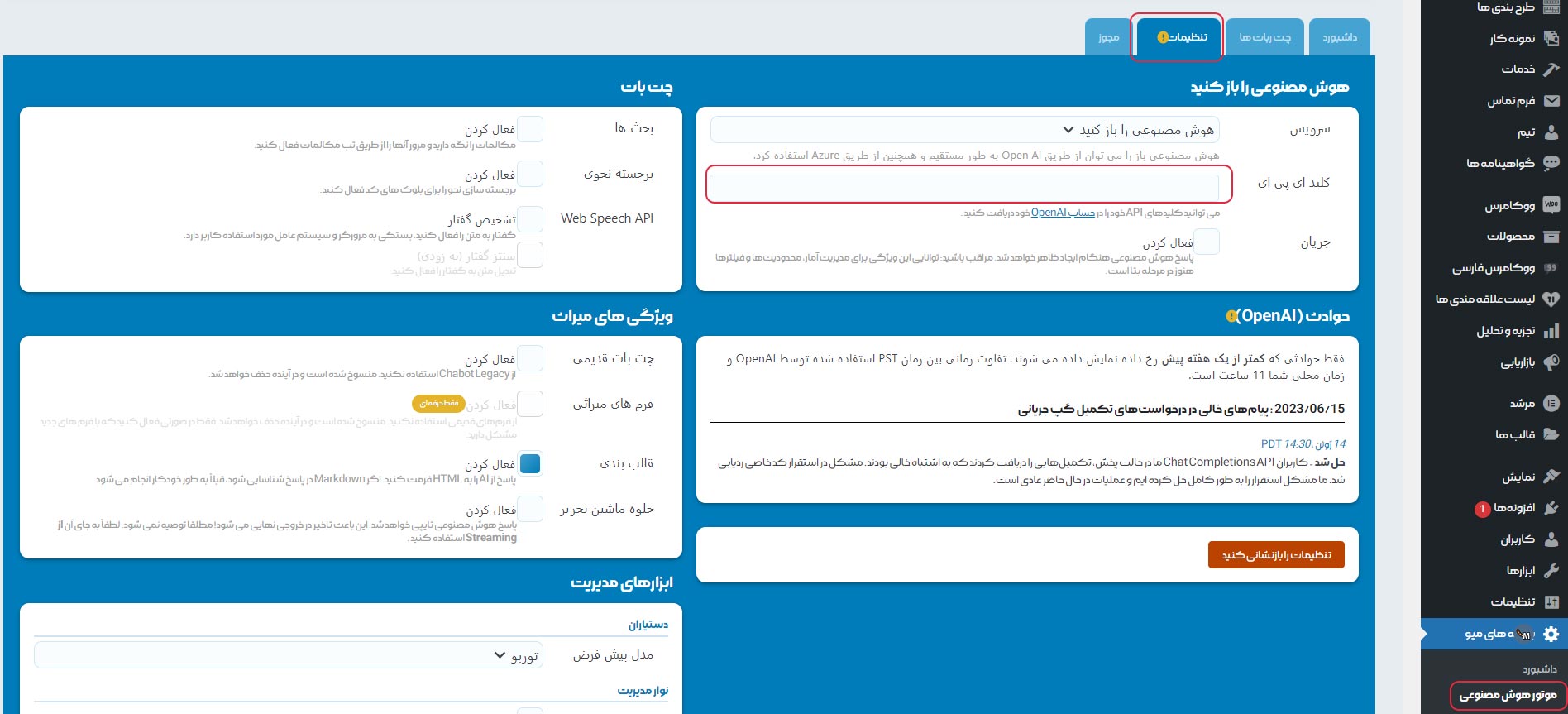 تنظیمات : مدل هوش مصنوعی و تعداد توکن مصرفی از این بخش قابل تنظیم است.