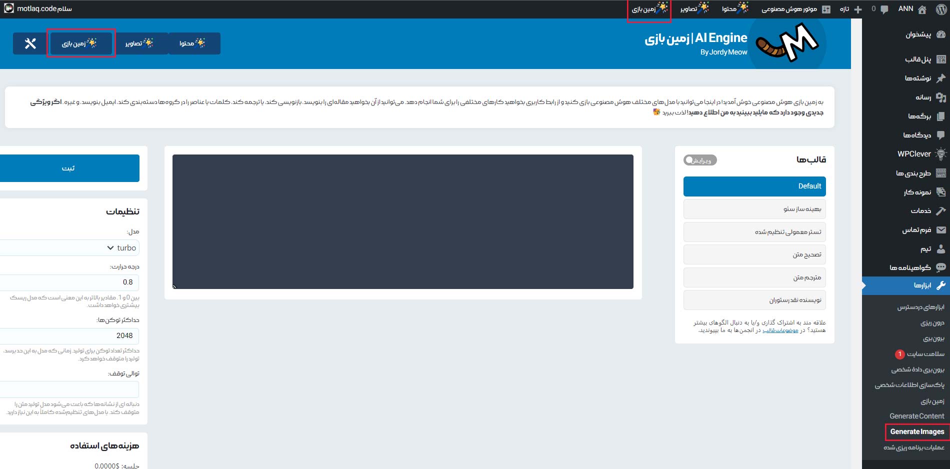 قالب ها : از این بخش میتوانید یکی از قالب های از پیش تعیین شده را برای تولید نصویر انتخاب کنید. در غیر این صورت تنظیمات قالب پیش فرض لحاظ میگرد.