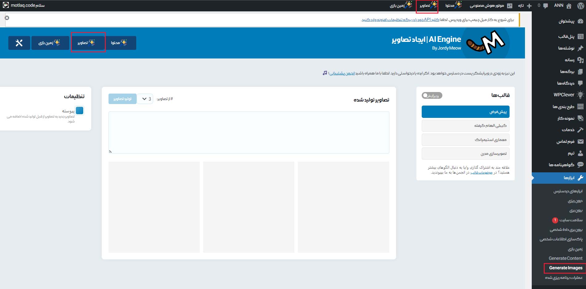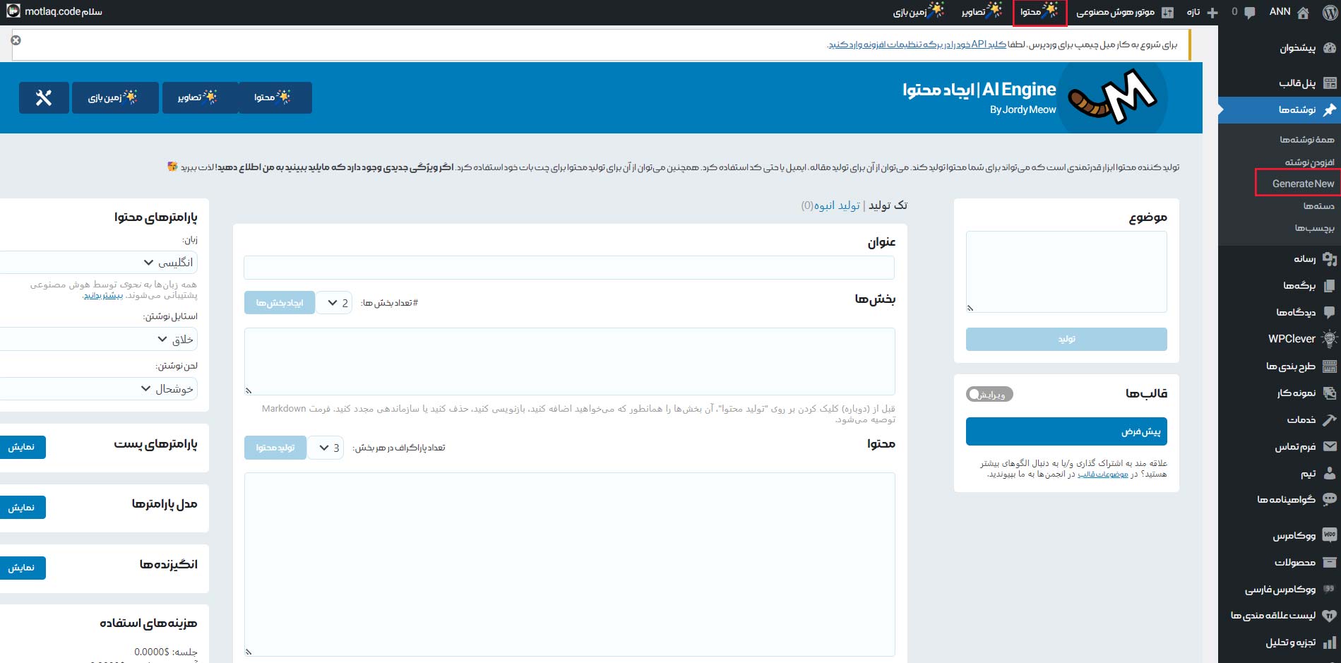 از پیشخوان وردپرس منوی Meow AI گزینه ی موتور هوش مصنوعی را انتخاب نمایید تا وارد صفحه ای مشابه تصویر زیر شوید.