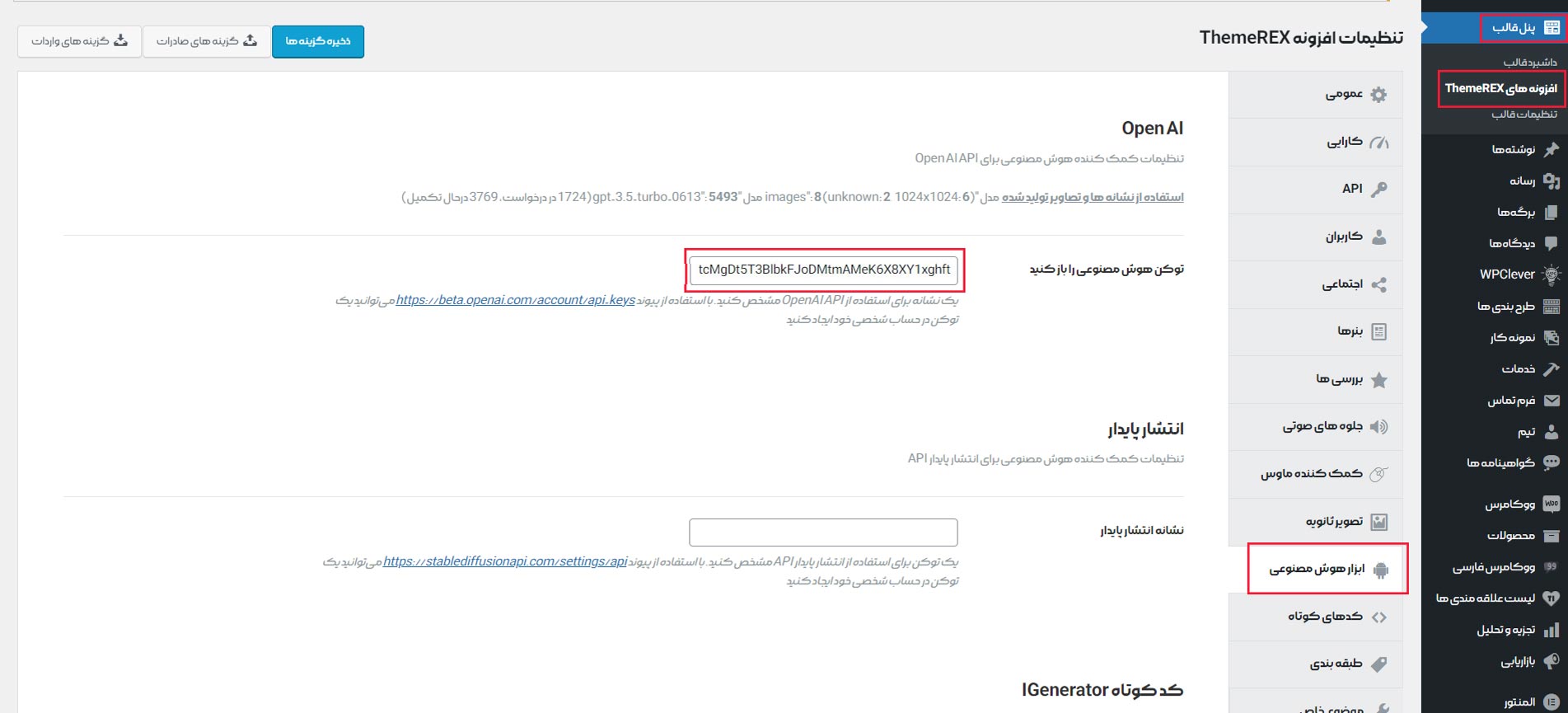 سپس توکنی که از چت جی پی تی دریافت کرده اید را در قسمت مشخص شده در تب تنظیمات وارد کنید.